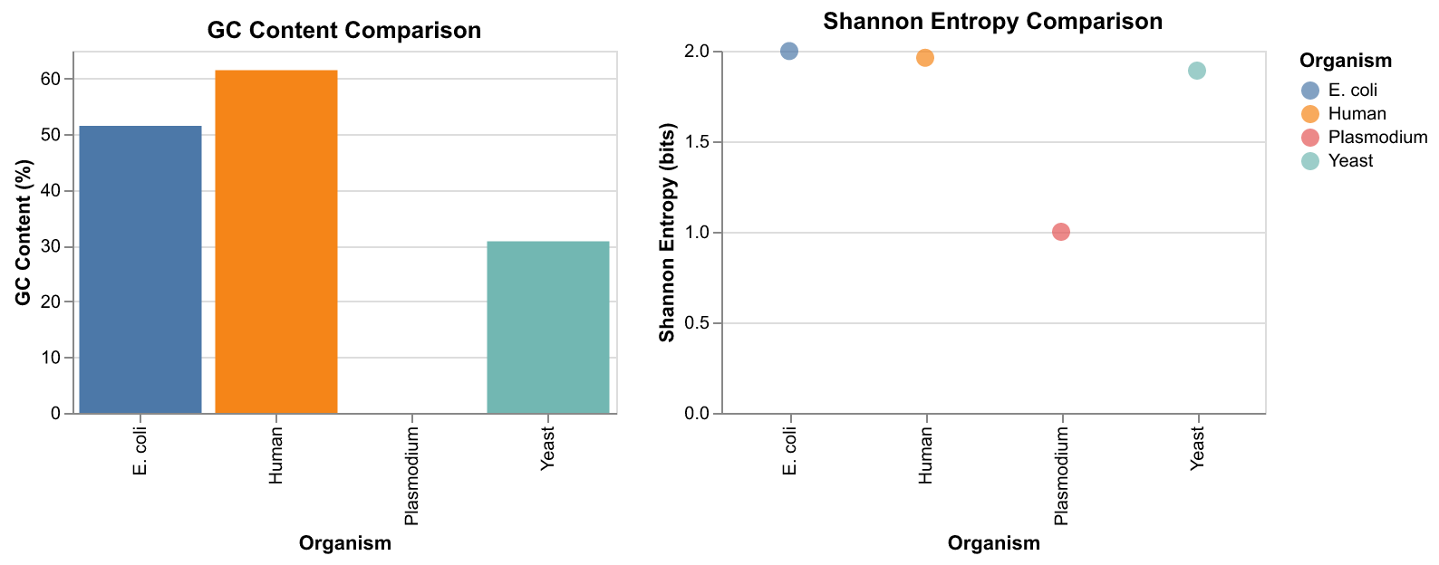 {'Organism': 'Yeast', 'GC Content (%)': 30.8, 'Shannon Entropy (bits)': 1.89},